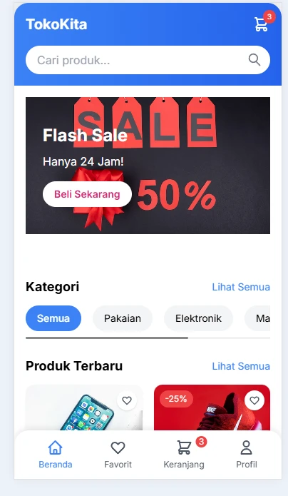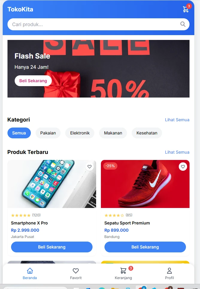 Kartu produk dengan: Gambar produk dari Unsplash Rating bintang Nama produk Harga Lokasi Tombol "Beli Sekarang" Badge diskon/status baru Tombol favorit